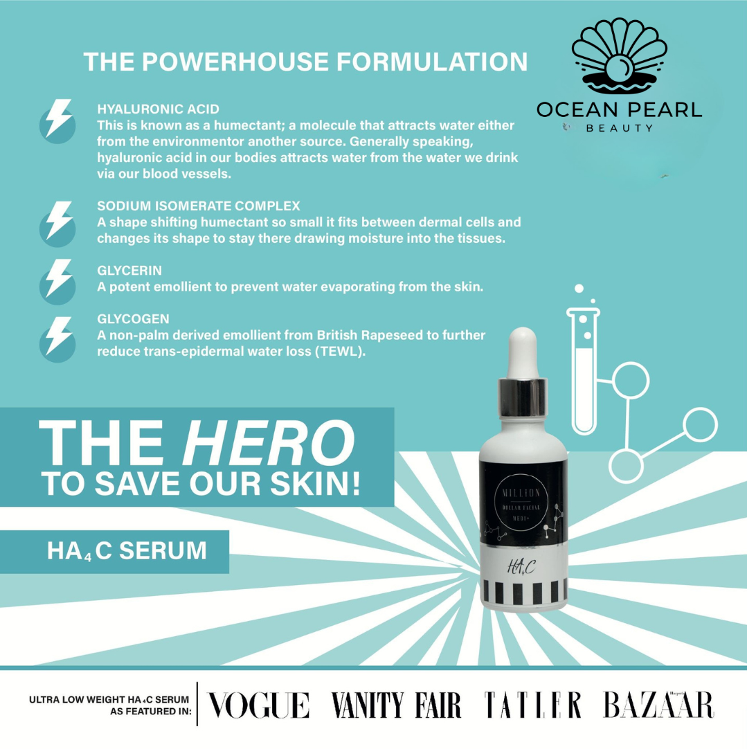 HA4C utilises an ultra-low molecular weight hyaluronic acid that is up to 60 times more soluble than standard hyaluronic acid, allowing for faster penetration through the layers of the skin. This ensures rapid, long-lasting hydration without heaviness or residue, making it suitable for all skin types.