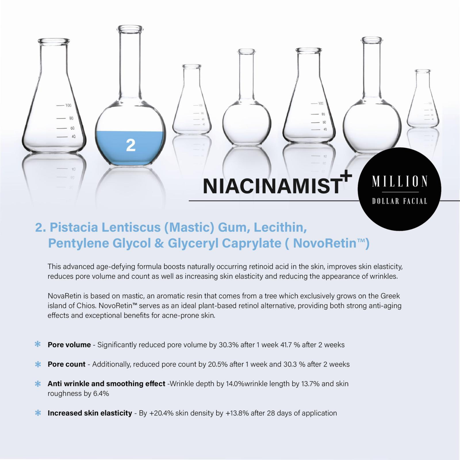 NovoRetin™ (derived from Pistacia Lentiscus gum) provides a plant-based retinol alternative that boosts naturally occurring retinoic acid activity in the skin without the irritation associated with traditional retinoids. This helps improve elasticity, reduce pore volume and soften fine lines and wrinkles.